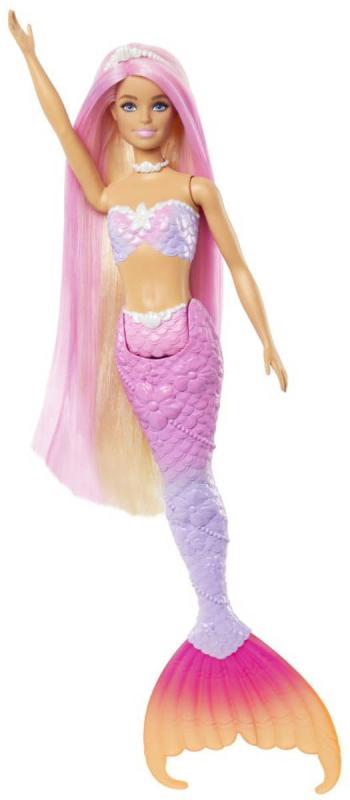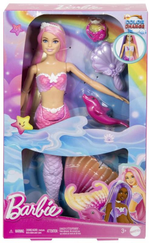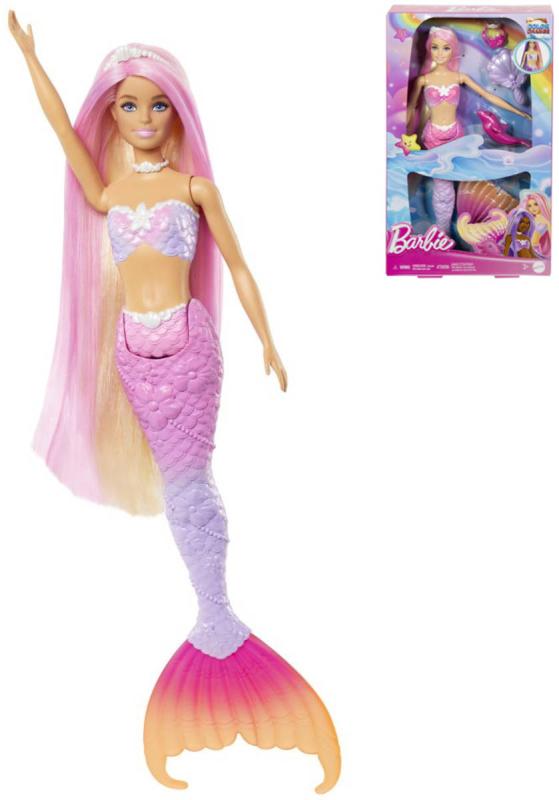 Panenka Barbie jako mořská panna Malibu, na motivy filmu Barbie a dotek kouzla, se změnou barvy.Tato panenka Barbie mořská panna inspirovaná filmem Barbie a dotek kouzla dodává hrám kouzlo díky možnosti proměny barev! Jako by ji očarovala podmořská magie, její super dlouhé vlasy, tvarovaný živůtek a ombre ocas mění barvy z růžové jako žvýkačka na tmavě fialovou. Je navržena s krásnými detaily od hlavy až k patě a patří k ní také stylingové doplňky, kartáč a roztomilý mazlíček z oceánu! Panenka Barbie nemůže plavat ani stát samostatně. Barvy a provedení dekorací se mohou lišit.