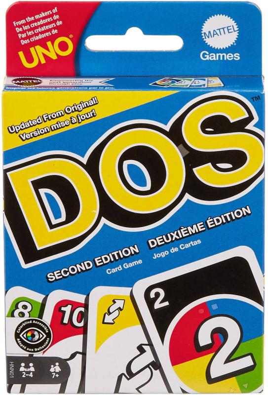 ***Stejně jako u karetních her UNO®, i ve hře DOS hráči závodí, kdo se jako první zbaví všech karet – tentokrát ale s novými kartami a pravidly, která dělají hru ještě zábavnější pro společné herní večery. Ve hře jsou dvě odkládací hromádky a každá karta s číslem 2 je "divokou kartou DOS", což znamená, že může představovat libovolnou barvu dvojky, jakou si hráč zvolí. Akční karty zahrnují klasiku, ale také novinku – kartu "Divoká karta: zahraj dvě", která přinutí dalšího hráče zahrát minimálně dvě karty během svého tahu, a pokud to nedokáže, musí si líznout dvě karty. Přátelé a rodina zažijí při hře dvojnásobnou akci a spoustu zábavy. Barvy a vzhled karet se mohou lišit.