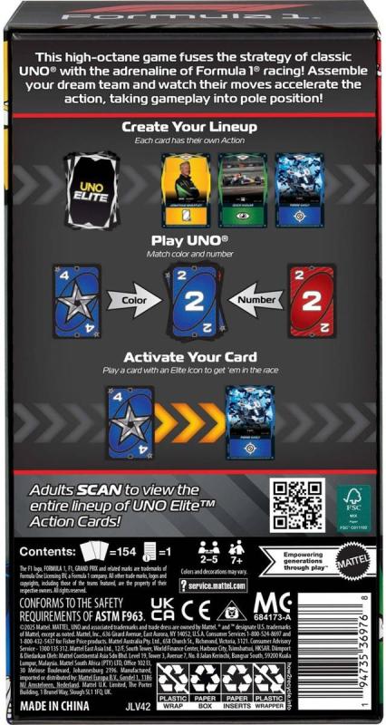 Tradiční hra UNO kombinuje speciální karty "Akční karta elitních jezdců", které zobrazují jezdce, auta i helmy ze světa Formule 1. Zařaďte tyto karty do svého týmu a přidejte tak do klasické hry vzrušující nové akce. Barvy a vzhled výrobku se mohou lišit.