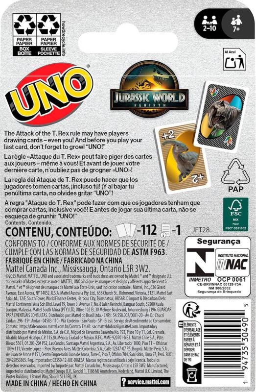 Fanoušci Jurského světa: Znovuzrození si zamilují hraní této tematické karetní hry UNO. Balíček obsahuje grafiku inspirovanou oblíbenými postavami a scénami z filmu a hráči se snaží spojovat barvy a čísla – navíc je zde speciální pravidlo "Útok T. Rexe", při kterém musí někdo líznout pět karet! A když vám zbývá poslední karta, nezapomeňte zavrčet "UNO!" Skvělý dárek pro milovníky Jurského světa: Znovuzrození a karetních her