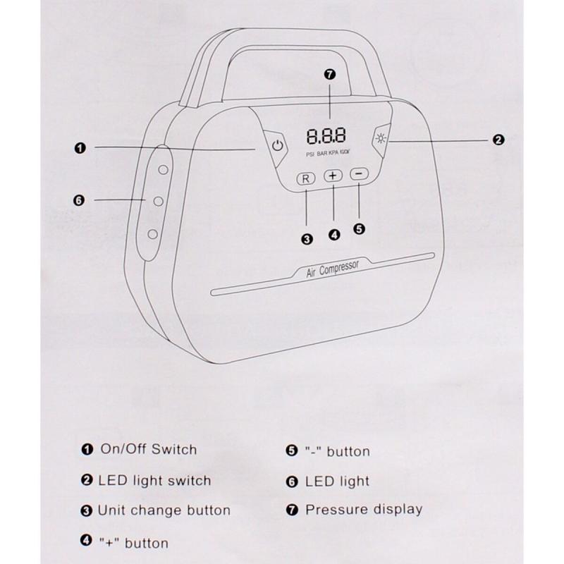 Součástí kompresoru je boční LED světlo se třemi režimy svícení a blikání, které usnadňuje práci za šera nebo v noci. Upozornění na bezpečné používání je důležité respektovat: kompresor nesmí používat děti bez dozoru dospělé osoby, není vhodné jej provozovat na přímém slunečním světle, při vysokých teplotách nebo za deště. Pro zachování funkčnosti je nutné nepoužívat přístroj nepřetržitě déle než 10 minut a po každém použití nechat zařízení 30 minut vychladnout. Skladování by mělo probíhat v suchém prostředí při pokojové teplotě.