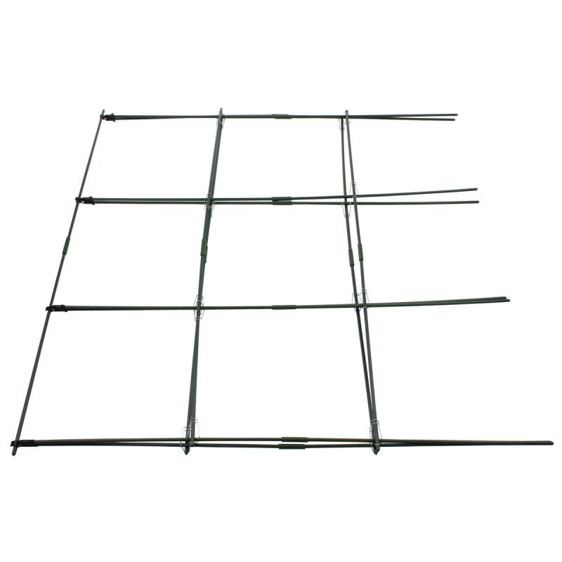 Celková délka stojanu je 150 cm, což odpovídá i délce jednotlivých tyček. Výška a šířka konstrukce jsou variabilní, přizpůsobíte je tak konkrétnímu prostoru a velikosti rostlin. Šířku lze nastavit v rozmezí přibližně 70 až 180 cm, výšku pak mezi 120 a 150 cm. Zelená barva stojanu přirozeně splyne s okolní vegetací a nenaruší vzhled zahrady.