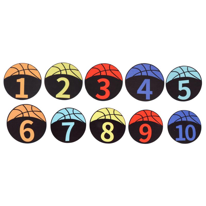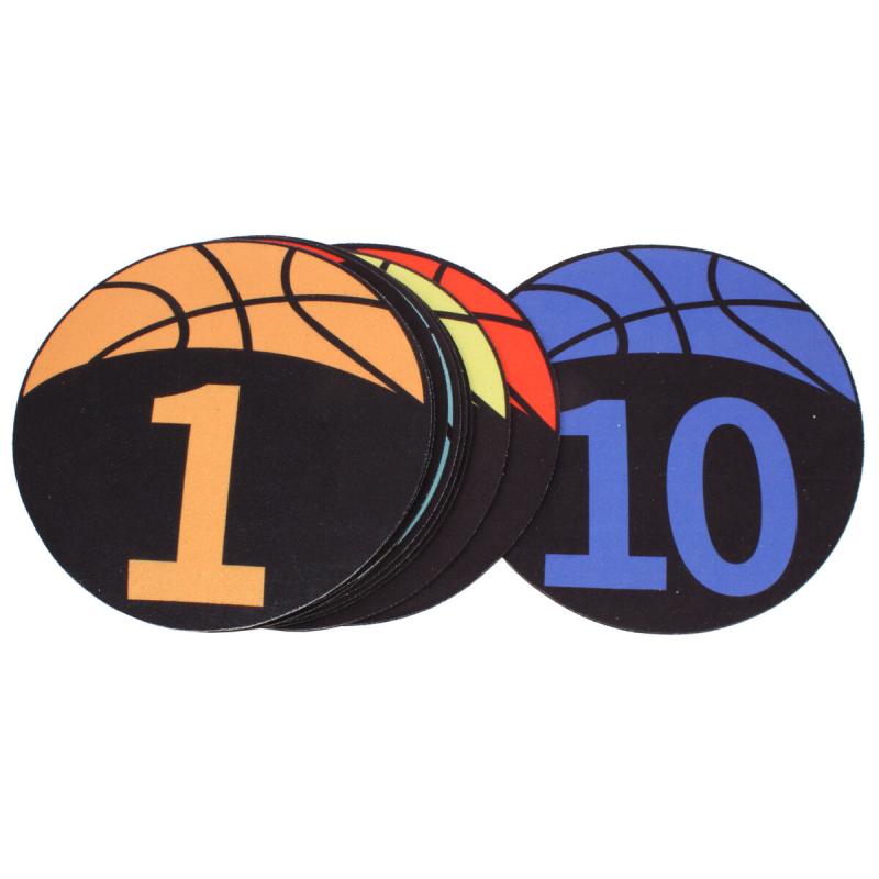 Sada 10 gumových značek s basketbalovým motivem, průměr 23 cm, s protiskluzovou spodní vrstvou pro bezpečný trénink v hale. zobrazit celý popis