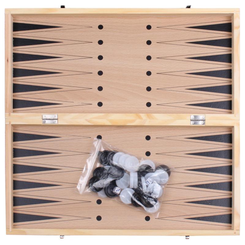 Uvnitř skládacího uzavíratelného boxu najdete 16 tmavých + 16 světlých figurek z borovicového dřeva pro šachy a dámu a 15 tmavých + 15 světlých plastových kamenů + 2 hrací kostičky pro vrhcáby (anglicky Backgammon, německy Wurfzabel). Samozřejmě nechybí ani hrací desky, šachová vně a uvnitř pro vrhcáby. Rozměr hrací plochy v rozloženém stavu je 39 x 39 cm, složený box má rozměr 39 x 19,5 x 5 cm a v originálním balení má hmotnost 0,95 kg. A ještě pro doplnění, nejvyšší šachová figurka měří 7,8 cm, nejmenší 3,4 cm a průměr kamenů pro vrhcáby je 2,7 cm.