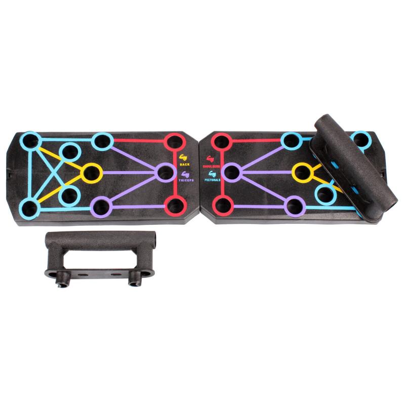 Skládací deska s barevně označenými pozicemi madel pro efektivní posilování zad, tricepsů, ramen a prsních svalů v domácím prostředí. zobrazit celý popis