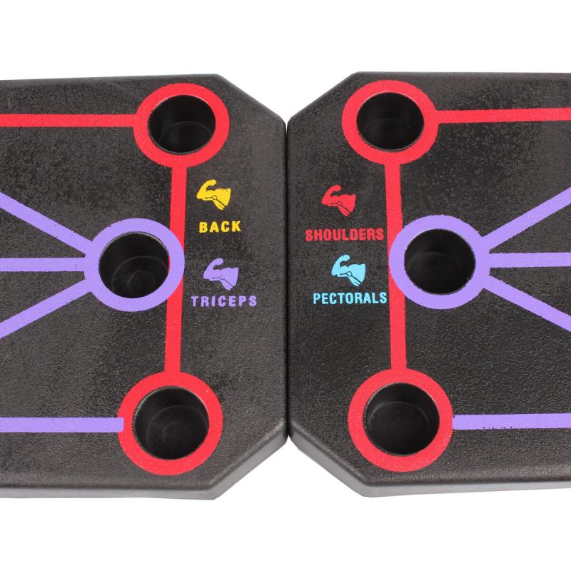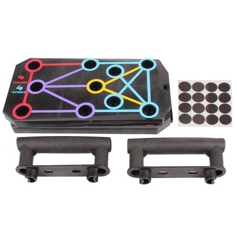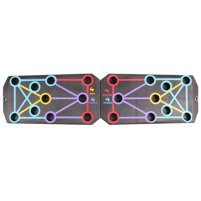 Multifunkční deska na kliky je navržena pro komplexní posilování zad, tricepsů, ramen a prsních svalů. Díky jednoduchému nastavení přiložených opěrek podle barevně rozlišených pozic na desce můžete snadno cílit na požadovanou svalovou skupinu. Skládací konstrukce z odolného polypropylenu zajišťuje dlouhou životnost a snadnou manipulaci. Po sestavení má deska rozměry 62 x 16 x 2 cm a váží přibližně 0,5 kg, což umožňuje její snadné přenášení a skladování. Barevné označení madel pomáhá přesně zaměřit trénink: