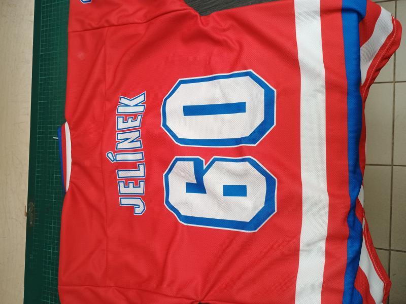 Replika československého hokejového dresu z roku 1976, ve kterém čeští hokejisté získali čtvrtou zlatou medaili z mistrovství světa v polských Katowicích. POZOR JEDNÁ SE O VÝPRODEJ POTIŠTĚNÉHO DRESU, ČÍSLO: 60, JMÉNO: JELÍNEK.