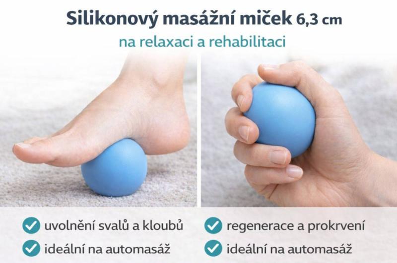 Praktický silikonový masážní míček pro uvolnění svalového napětí, stimulaci prokrvení a jemnou regeneraci. Ideální na automasáž, rehabilitační cvičení i antistresové mačkání.