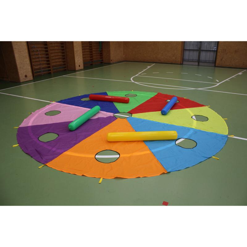 Je tak vhodný najmä pre učiteľov alebo táborových vedúcich k organizovaniu aktivít celej skupiny detí, či už v prírode alebo vo vnútorných priestoroch telocvične. Parachute je vyrobený z veľmi ľahkého polyesteru, zošitý z pastelovo farebných dielov s lemovanými kruhovými otvormi s priemerom 30 cm a jedným otvorom priamo v strede. Po celom vonkajšom obvode sa nachádzajú pútka na uchopenie a napnutie kruhu. Súčasťou balenia sú aj štyri 100 cm dlhé nafukovacie kyje pre obľúbenú detskú hru „na krtka“, kedy sa jeden z hráčov nachádza v stredovom otvore kruhu a usiluje o zasiahnutie kyjom čo najväčšieho počtu „krtkov“, ktorí vystrkujú hlavy z dier okolo v momente, keď je hráč s nafukovacím kyjom uprostred nepozorný. Priemer celého kruhového padáka sa líši v závislosti od jednej z dvoch ponúkaných veľkostí.