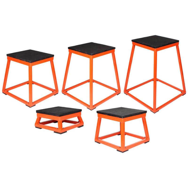 Sada piatich plyo boxov rôznych výšok z ocele s gumovými rohmi pre rozvoj výbušnej sily, rýchlosti a vytrvalosti pri plyometrickom tréningu. Zobraziť celý popis