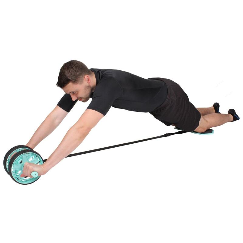 V setu naleznete kromě kolečka také podložku pod kolena a nastavitelný elastický pás. Jeden konec pásu je připevněný k podložce a druhý se nasune doprostřed osy kolečka. Následným utažením nebo povolením pásu si nastavíte obtížnost cvičení. Čím bude pás delší, tím bude posilování obtížnější. Na pásu jsou jednotlivé stupně prakticky označeny našitými proužky. Nejpokročilejší sportovci mohou pás zcela odepnout. Dvě kolečka z pevného plastu s protiskluzovým povrchem, ocelová osa a na dotek příjemné rukojeti zaručují stabilitu a pohodlí. Podložka na kolena má plastovou základnu a povrch z příjemné měkké pěny.