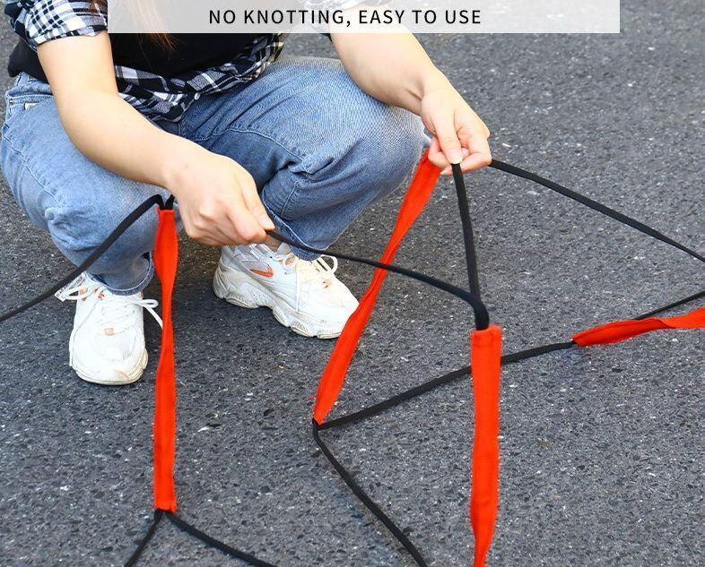 Krajní příčky jsou opatřeny suchým zipem, který umožňuje jejich spojení do uzavřeného boxu nebo propojení více kusů žebříků pro vytvoření delší tréninkové dráhy. Tato variabilita rozšiřuje možnosti využití pomůcky a přizpůsobí ji různým tréninkovým potřebám.