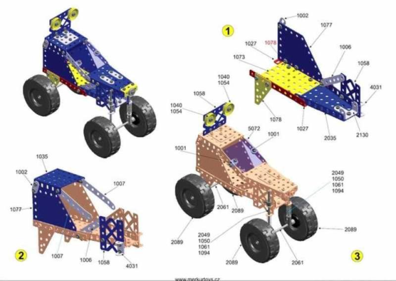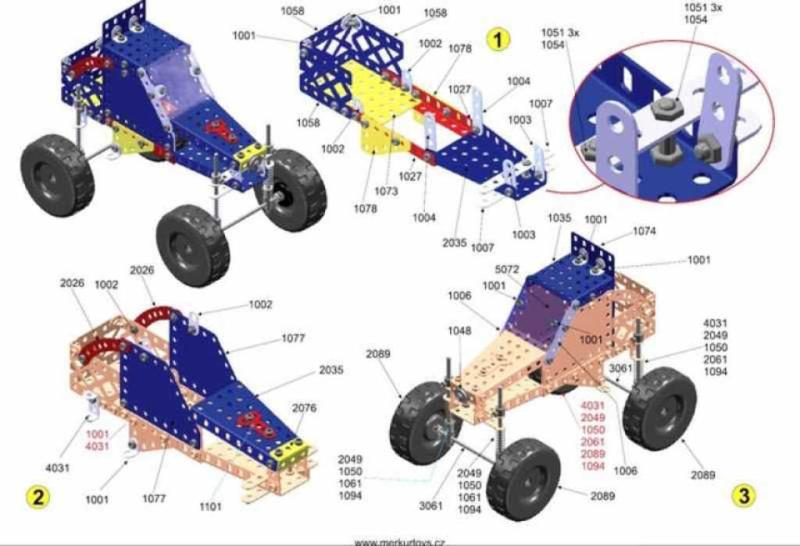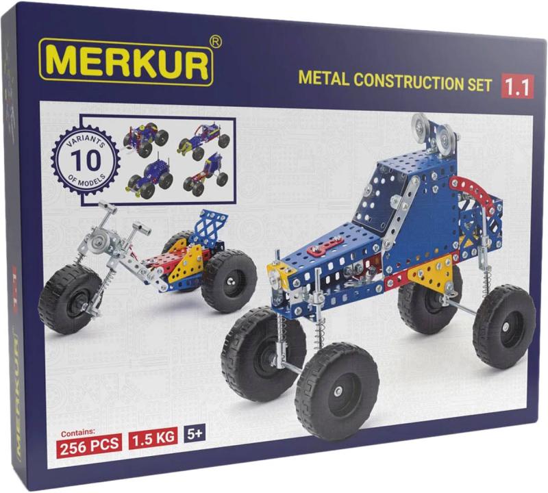 MERKUR 1.1 - Extreme Buggy - Kvalitní kovová stavebnice vyrobená v Česku.Tradiční česká konstrukční stavebnice z kovu, ze které můžete stavět dle své fantazie nebo použít přiložený návod a pomocí šroubků a matiček si sestavit až 10 modelů různých terénních vozidel.
