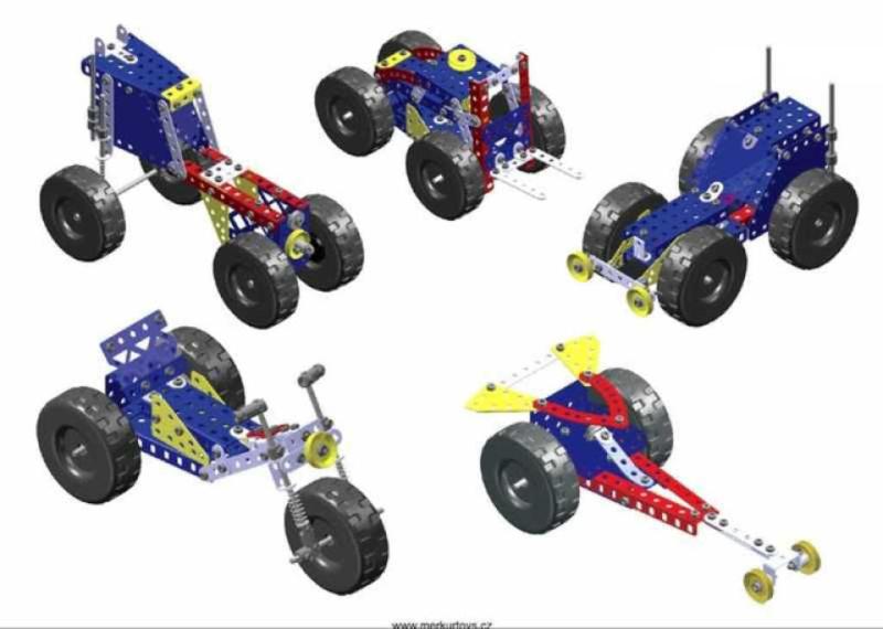 Tradiční česká konstrukční stavebnice z kovu, ze které můžete stavět dle své fantazie nebo použít přiložený návod a pomocí šroubků a matiček si sestavit až 10 modelů různých terénních vozidel.