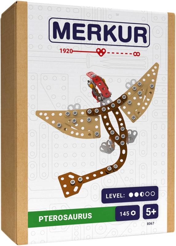 MERKUR 8067 Dinosauři: Pterosaurus. Kvalitní, kovová konstrukční stavebnice, 145 dílků, model 20cm, součástí návod + pracovní nářadí. Vyrobeno v Česku.Kovový model pravěký ještěr Pterodactyl z kolekce dinosaurů obsahuje součástky nutné pro sestavení tohoto modelu. V balení najdete podrobný návod, Merkur sadu nářadí a unikátní Merkur díly. Merkur díly jsou univerzální a tak vás neomezí v jakékoli modifikaci a nápadu. Stavebnici tak můžete sestavit podle přiloženého návodu nebo čistě podle svých představ. Se sestavenými modely si lze hrát, jsou velmi odolné. Podporuje a rozvíjí manuálních schopnosti, logické myšlení, soustředění.