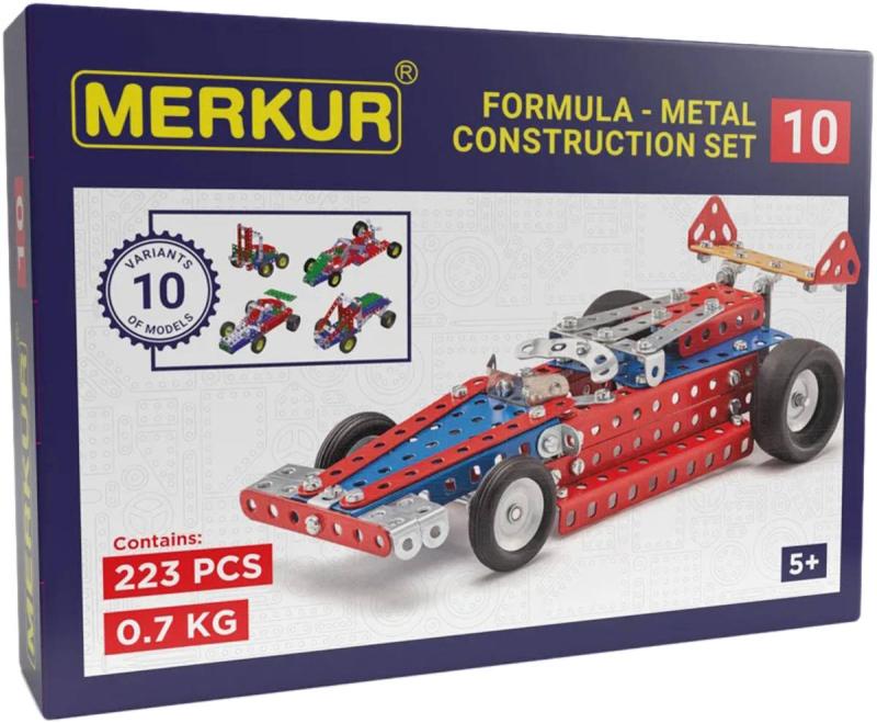 MERKUR M010 - Formule - Kvalitní kovová stavebnice vyrobená v Česku.Tradiční česká konstrukční stavebnice z kovu, ze které můžete stavět dle své fantazie nebo použít přiložený návod a pomocí šroubků a matiček si sestavit až 10 různých modelů závodních aut.