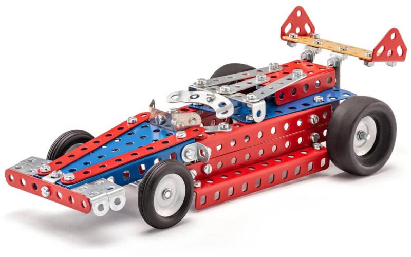 Tradiční česká konstrukční stavebnice z kovu, ze které můžete stavět dle své fantazie nebo použít přiložený návod a pomocí šroubků a matiček si sestavit až 10 různých modelů závodních aut.
