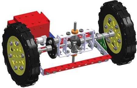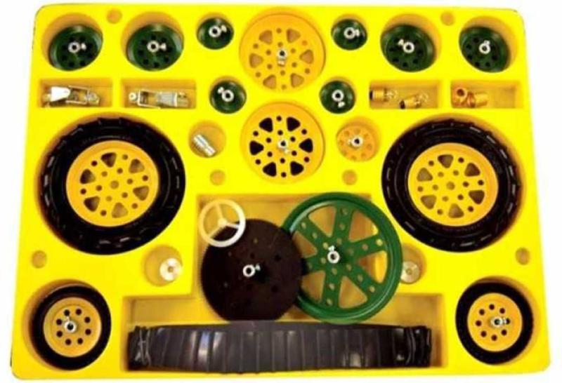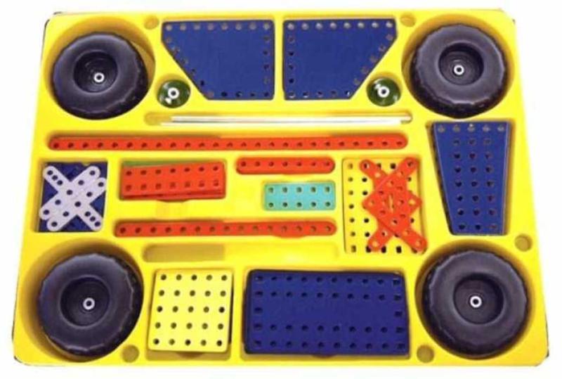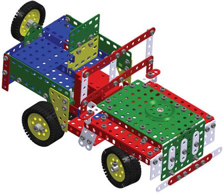 pásů, traktorových kol, ozubených a převodových kol, motorku, dlouhých úhelníků, pásků atd. Ze stavebnice lze také sestavit modely terénních vozidel. Součástí stavebnice je velká návodová knížka s