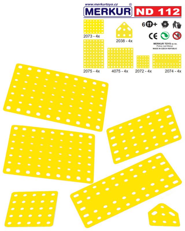 Doplňková sada velkých destiček ve žluté a bílé barvě z plastu pro stavebnici Merkur.Nejznámější česká hračka Merkur. Merkur vznikl počátkem minulého století v Polici nad Metují. Tradiční česká kovová konstrukční stavebnice, ze které můžete stavět dle své fantazie nebo použít přiložený návod na sestavení nejrůznějších modelů. Všechno můžete sestavit pomocí šroubků a matiček. Tato dnes již retro hračka je stále velmi oblíbená a jistě i dospělí se rádi připojí k dětské hře a vzpomenou si tak s nostalgií na vlastní dětství s tradiční stavebnicí.