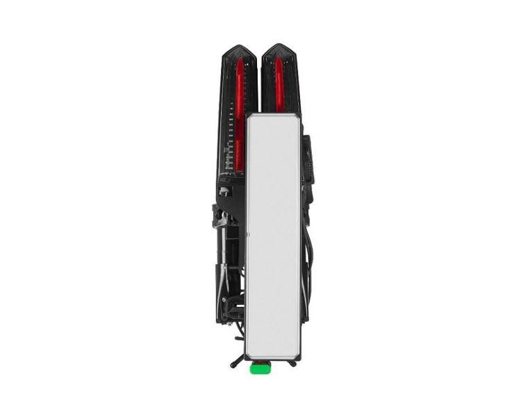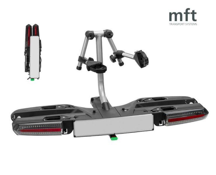 Kompaktný, skladací nosič 2 kolies compact 2e+1 od firmy MFT s LED svetelnou rampou.Rýchle a jednoduché automatické upevnenie nosiča na guľový čap. Kompletné uzamykateľný, vybavený držiakom registračnej značky. Jednoducho sklopný pre ľahký prístup do kufra vozidla aj s naloženými kolesami a skladný pre úsporu miesta pri jeho skladovaní. Vysoká nosnosť až 60 kg umožňuje prepravu elektrobicyklov. LED osvetlenie podčiarkuje moderný dizajn nosiča.