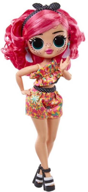 Obsah balení: panenka OMG Velká ségra, 3 módní doplňky, 1 pár náušnic, 1 pár bot, 2 laky na nehty, 24 barevných nalepovacích nehtů, 24 lepenek pod nehty, 3 listy se samolepkami na nehty, sáček se třpytkami, lahvička na třpytky, pilník