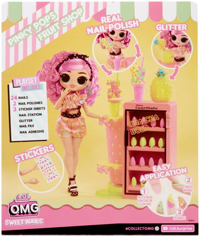 LOL Surprise ! OMG Nehtové studio - herní set Fruit Shop s panenkou Velká ségra Pinky Pops. Součástí skutečné laky na nehty a spousta doplňků ke zkrášlování a zdobení nehtů (nalepovací nehty, samolepky).OMG Velká ségra přináší unikátní nehtové studio. Dopřej si zážitek z dokonalé manikúry. V balení najdeš více než 15 překvapení včetně nalepovacích nehtů, pilníku a laků na nehty. Každá panenka má jiné tematické studio. Nehty si můžeš ozdobit podle svého vkusu samolepkami a třpytkami.