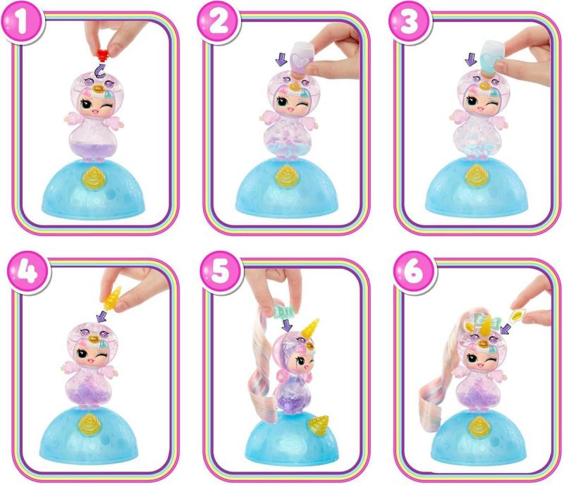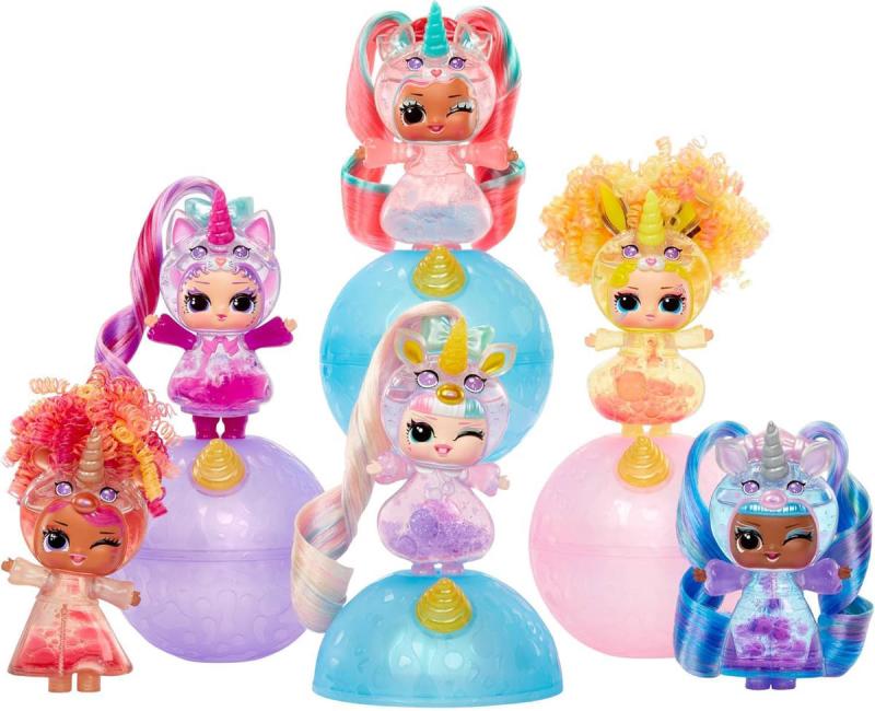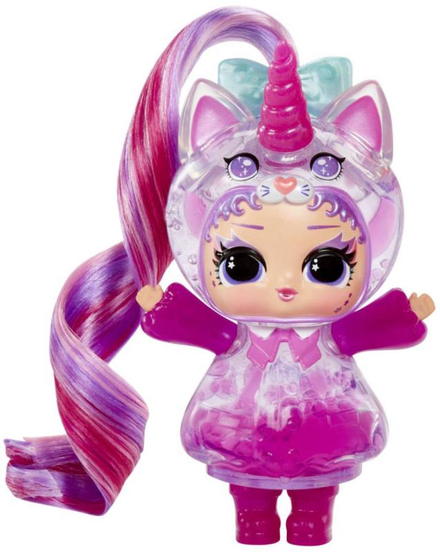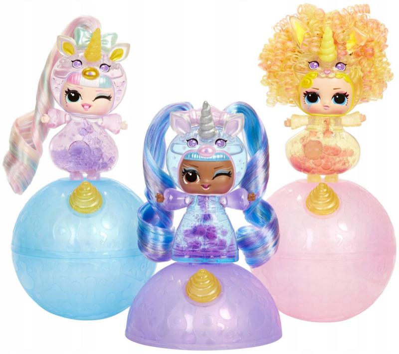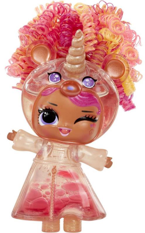 L.O.L. Surprise! panenka s průhledným tělem a hlavou ve tvaru jednorožce. V balení najdeš 2 lahvičky s tekutinou k naplnění těla. Po naplnění budou v panence klouzat barevné bubliny a panenka bude vyvolávat efekt lávové lampy. V sérii můžeš sesbírat 8 panenek.