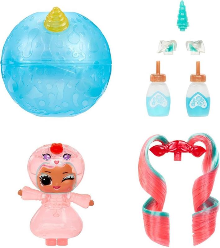 Obsah balení: panenka s průhledným tělem, 2 lahvičky s barevnou tekutinou, česatelné vlásky k připnutí, doplňky