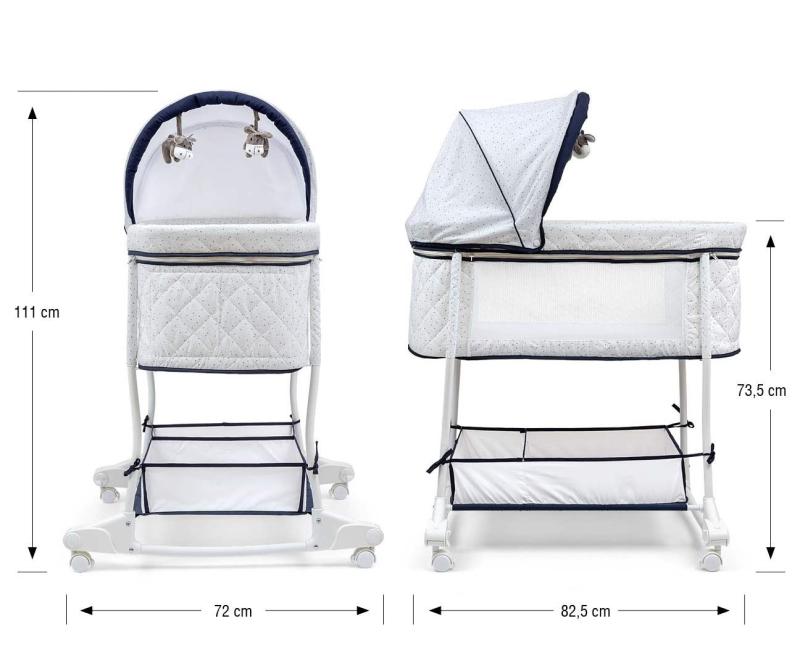 Rozměry přenosné postýlky: 83 cm x 42,5 cm x 32 cm.