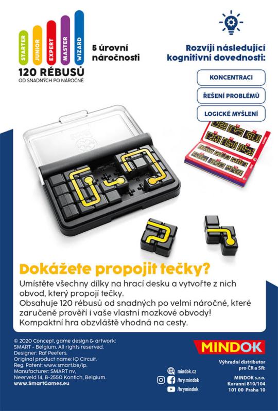 Hlavolamová hra IQ Obvody, z řady Smart Games, od Mindoku.Umístěte všechny dílky na hrací desku a vytvořte z nich obvod, který propojí tečky. Hra IQ obvody bsahuje 120 rébusů. Od snadných po velmi náročné, které zaručeně prověří i vaše vlastní