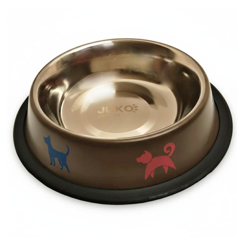 Hnedá nerezová miska s farebnými psíkmi po obvode. Miska je opatrená gumovým krúžkom, aby bola stabilná a nešmýkala sa po podlahe.