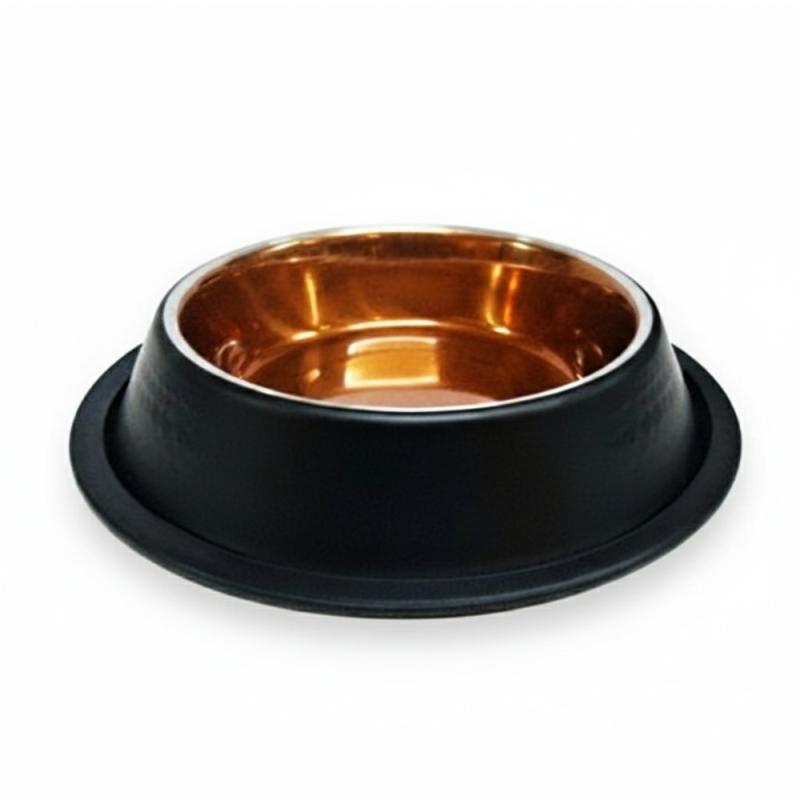 Nerezová miska v veľmi netradičnom vzhľade. Kombinácia čiernej farby na vonkajšej strane a medenej vo vnútri je netradičná a zaujímavá. Spodný okraj je opatrený gumou, aby miska nešmýkala po podlahe.