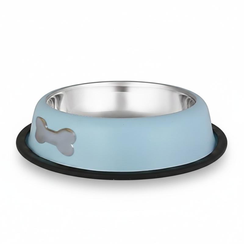 Nerezová miska, ktorá zaujme aj svojim vzhľadom. Vonkajšiu stranu v svetlomodrej farbe dopĺňa znak kosti. Spodný okraj je opatrený gumou, miska nešmýka po podlahe.