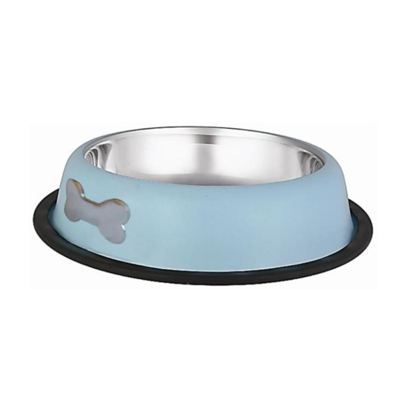 Nerezová miska, která zaujme také svým vzhledem. Vnější stranu ve světle modré barvě doplňuje znak kosti. Spodní okraj je opatřen gumou, miska neklouže po podlaze.