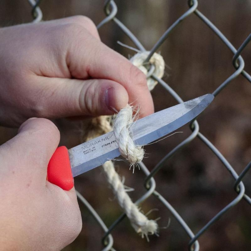 Čepeľ má čiastočne zúbkovaný tvar s tupým koncom, čo zvyšuje bezpečnosť pri práci a zároveň umožňuje efektívne rezanie vetiev, lana alebo iných prekážok. Scandi výbrus čepele je tradičným a osvedčeným tvarom, ktorý uľahčuje presné a jednoduché rezanie.