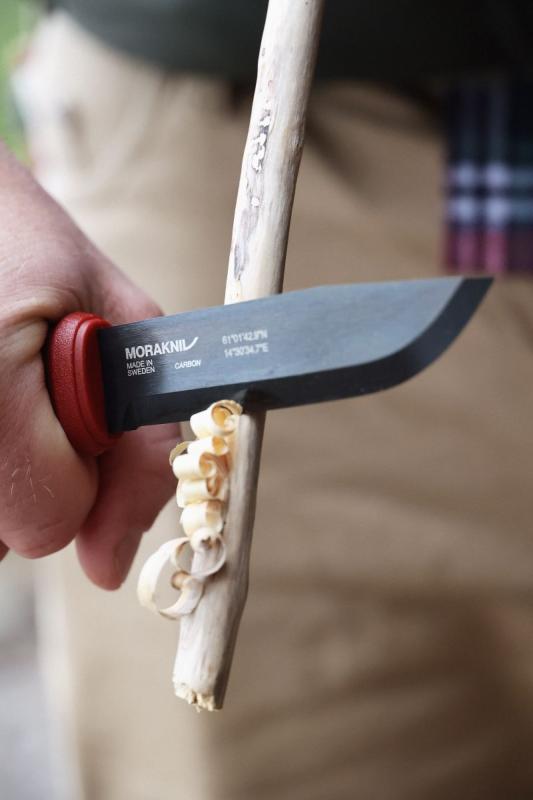 Čepeľ je vyrobená z vysoko kvalitnej švédskej uhlíkovej ocele s tvrdosťou HRC 58-60, ktorá vďaka čiernej DLC vrstve ponúka zvýšenú odolnosť proti korózii a dlhotrvajúcu ostrosť. Brúsenie v škandinávskom štýle zabezpečuje ľahké a presné rezanie.
