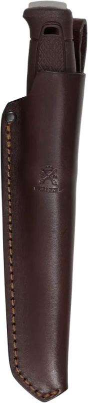 Nůž je dodáván s praktickým pouzdrem z evropské kůže činěné rostlinnými látkami v příjemné hnědé barvě, které má poutko na opasek pro snadné nošení.