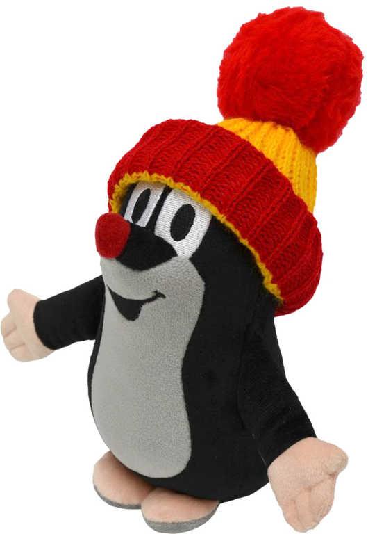 Plyšový Krteček se sundavací čepicí, ve spodní části je naplněn fazolkami, rozvíjející hmatové schopnosti dítěte. Červeno-žlutá čepice.