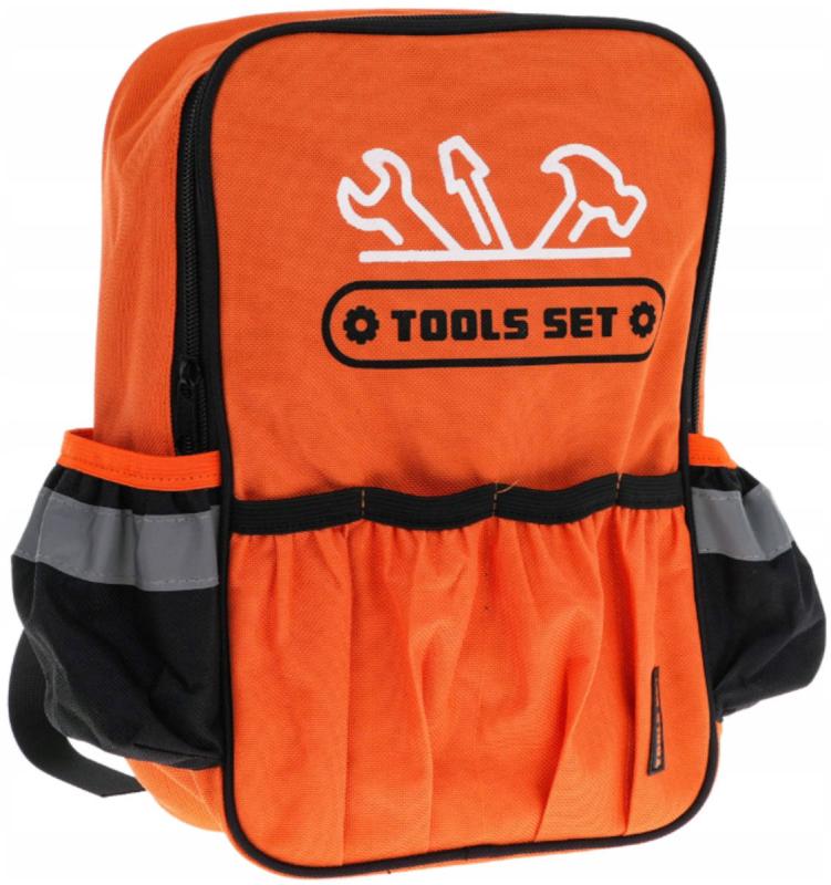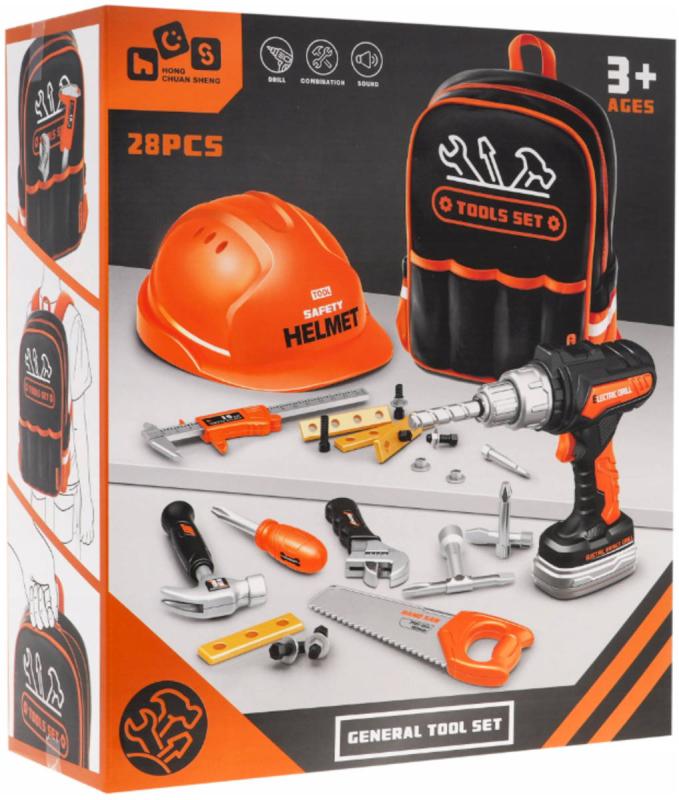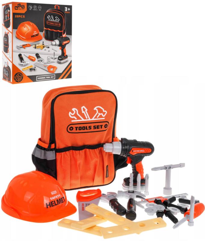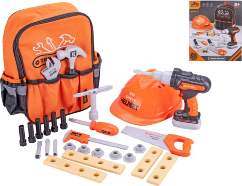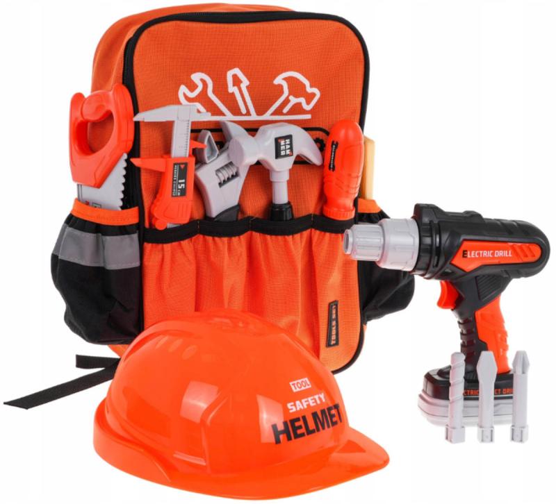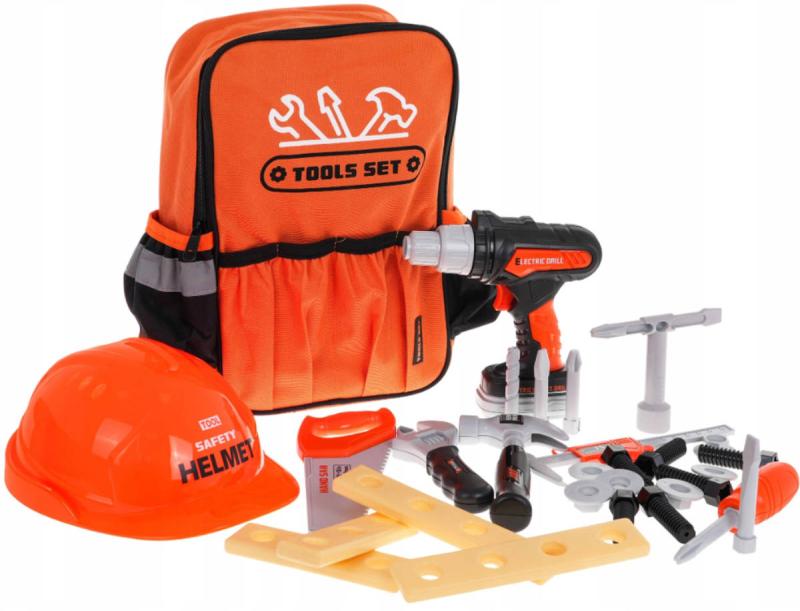 Obsah balení: batůžek, ochranná helma, dětské pracovní nářadí s doplňky (vrtačka, pilka, kladívko, francouzský klíč, šroubovák, šroubky a matice ... )