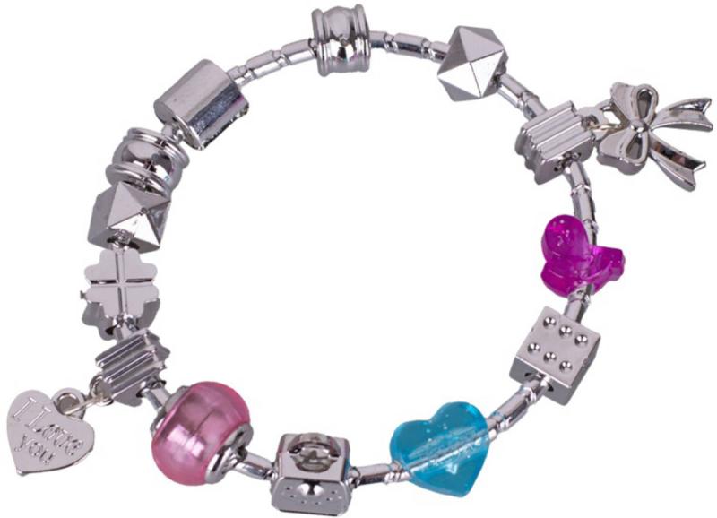 Stříbrný plastový náramek s korálky a přívěsky, který si můžeš obměnit podle své fantazie. Velikost 6,5cm, 2 varianty.Náramek s doplňky je stylový doplněk pro malé parádnice, které si rády hrají na princezny nebo módní návrhářky. Tento plastový náramek je navržen tak, aby se snadno nasazoval na dětské zápěstí a zároveň poskytoval prostor pro vlastní kreativitu. Součástí balení jsou drobné ozdobné doplňky, které lze na náramek připevnit a vytvořit tak originální vzhled podle vlastního vkusu. Hračka podporuje jemnou motoriku, estetické cítění a rozvoj fantazie. Vhodná jako drobný dárek nebo doplněk ke kostýmům. Dostupná ve dvou variantách provedení, které se liší barevností a typem dekorací.