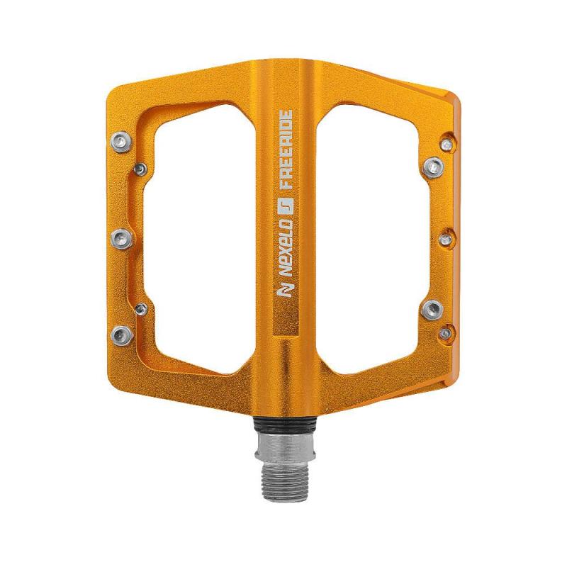 Lehké platformové pedály z hliníku s průmyslovými ložisky a vyměnitelnými piny pro pevný a jistý úchop během jízdy.