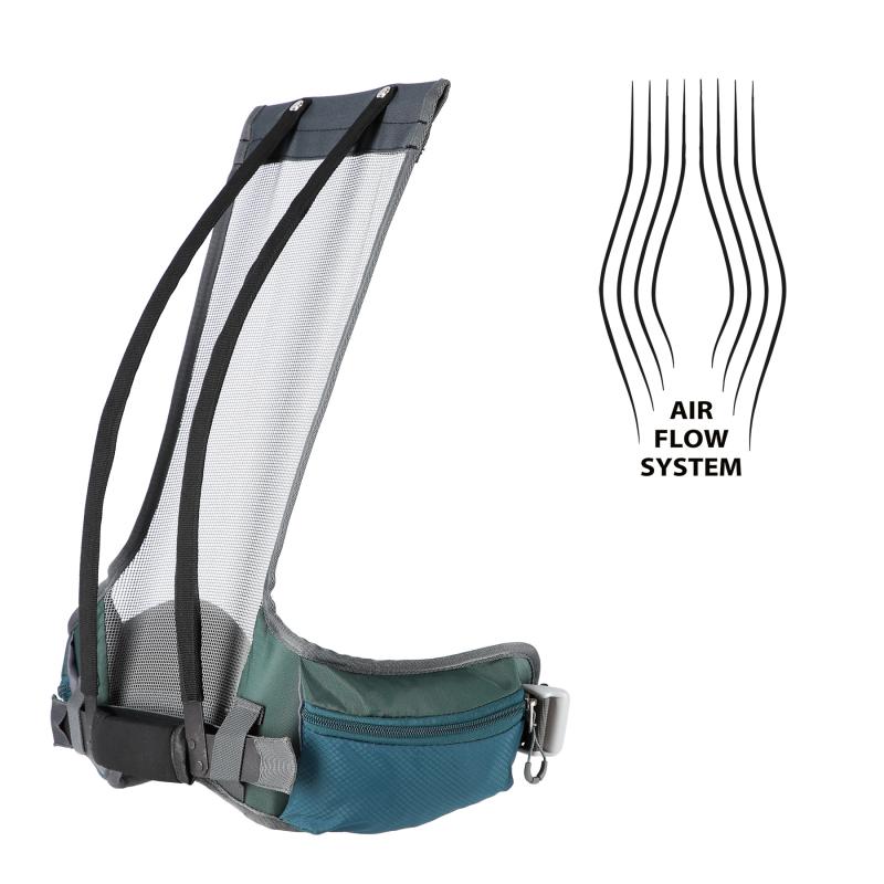 Jedinečný ventilační systém odděluje hlavní komoru od zad a zajišťuje cirkulaci vzduchu a pohodlí i v tom nejteplejším počasí. Celá váha batohu navíc spočívá na profilovaném rámu, který snižuje tlak na páteř a zvyšuje pohodlí při dlouhých horských výletech. Panel je spojen s bederním popruhem a lze jej snadno vyjmout.