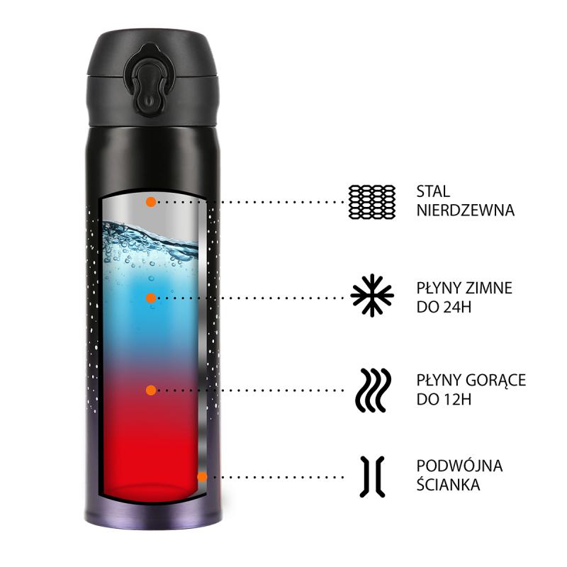 Termoska je vyrobena z nerezové oceli s dvojitou stěnou, která zaručuje uchování teplých nápojů po dobu 12 hodin a studených po dobu 24 hodin, nezáleží tedy, zda si do termosky připravíte ranní kávu, kterou vypijete v kanceláři a nebo zda si do ní přelijete oblíbenou limonádu a vezmete si ji s sebou na několikahodinovou procházku do přírody, termoska udrží Váš nápoj ve správné teplotě.