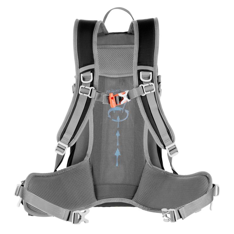 Na pracke hrudného popruhu je umiestnená integrovaná záchranná píšťalka pre väčšiu bezpečnosť v núdzových situáciách. Batoh ďalej ponúka ďalší panel s úchytmi na rôzne príslušenstvo, dve bočné sieťované vrecká a vrecká na zips v bedrovom páse, ideálne pre uloženie telefónu alebo iných drobností.
