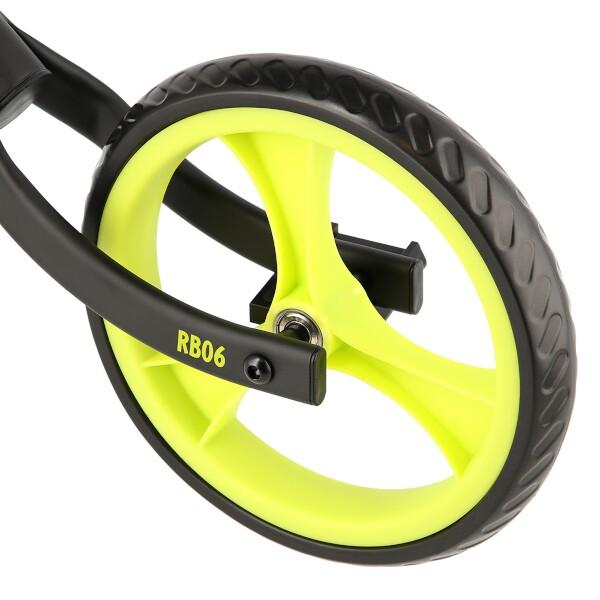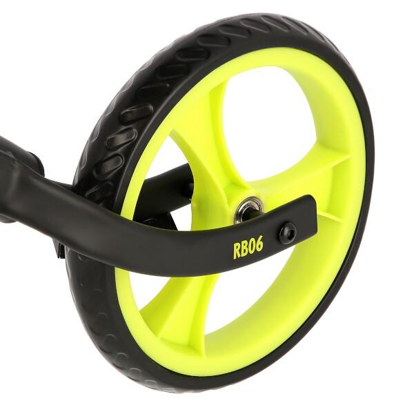 Konstrukce RB06 je vyrobena z kvalitní, lakované oceli. Pro maximální bezpečí jsou všechny hrany zaoblené. Rukojeti jsou osazeny gripy s límcem na obou stranách, který zamezuje zklouznutí dlaně. Středové složení je vypaveno zarážkou, která zamezuje protočení řídítek. Plastová kola jsou osazena 9", plnou pneumatikou, která nejde prorazit. Ložiska ABEC 9 zaručují plynulou jízdu. Řídítka a sedlo jsou výškově nastavitelné.