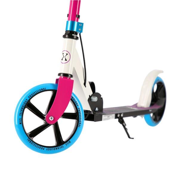 Zadný blatník slúži ako prítlačná brzda, ktorá ešte podčiarkuje brzdný účinok mechanickej brzdy ovládanej lankom z páčky na riadidlách, tie sú opatrené gumovými rukoväťami, ktoré zabezpečujú pevný a pohodlný úchop. Riadidlá sú výškovo nastaviteľné do 3 úrovní. Veľké kolesá sú osadené ložiskami ABEC 7 a polyuretánovou pneumatikou s priemerom 200 milimetrov. Táto kombinácia zabezpečuje rýchlu, plynulú a bezpečnú jazdu.