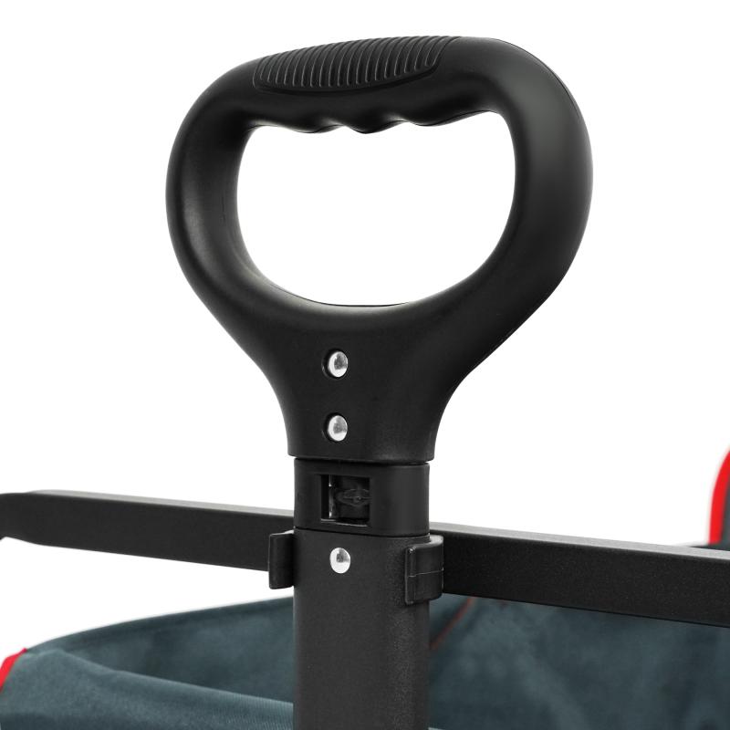 Vozík je navržen s důrazem na pohodlí. Má nastavitelné madlo, které lze přizpůsobit výšce uživatele a zajistit tak ergonomické a pohodlné vedení. Velká široká kola o rozměrech 18 x 10 cm vyrobená z kombinace polypropylenu a PVC zvládají bez problémů různé povrchy – asfalt, trávu i písek. Zadní steňu lze sklopit a uložit tak například delší předměty. Přední kola jsou opatřena brzdami pro zajištění vozíku na místě.