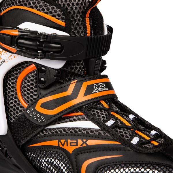Kolieskové korčule NILS EXTREME NA 1060 S sú slalomové korčule ideálne na rýchlu jazdu. Polomekká topánka je vyrobená z kombinácie nylonu a polypropylénu vystuženého skleneným vláknom, ďalej je vybavená systémom ventilácie pre maximálne pohodlie. Vložka je priedušná a jej zapínanie je riešené klasickou trojkombináciou (dvojsekčná pracka, pásik na suchý zips a šnurovanie). Čepeľ je vyrobená z hliníka s hrúbkou 3,4 mm. PU kolieska s priemerom 100 mm a tvrdosťou 82A sú osadené ložiskami ABEC 9. Korčule sú vhodné pre pokročilých a skúsených jazdcov.