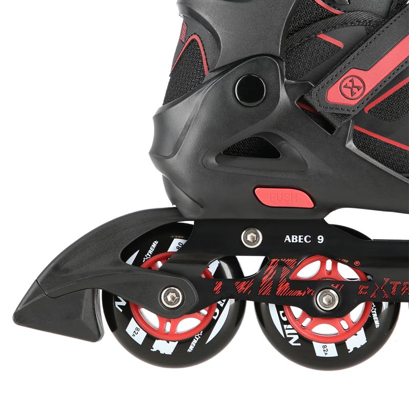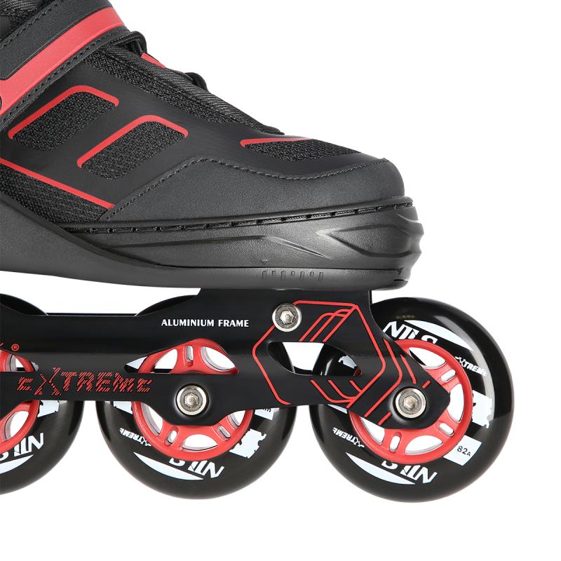 Kolečkové brusle NILS Extreme NA14174 jsou vhodné k rekreační jízdě po tvrdém a rovném povrchu. Podvozek brusle je vyroben z hliníku a je osazen PU kolečky o tvrdosti 82A s ložisky ABEC 9. Poloměkká bota je vyrobena z polypropylenu, který je velice odolný. Vložka je profilovaná a prodyšná. Brusle je možné pomocí stisku tlačítka a posunutí přední částí boty nastavit do jedné ze čtyř velikostí. Zapínání je řešeno klasickou trojkombinací (dvousekční přezka, pásek se suchým zipem a šněrování). Model NA14174 je určen pro začínající a středně pokročilé bruslaře.