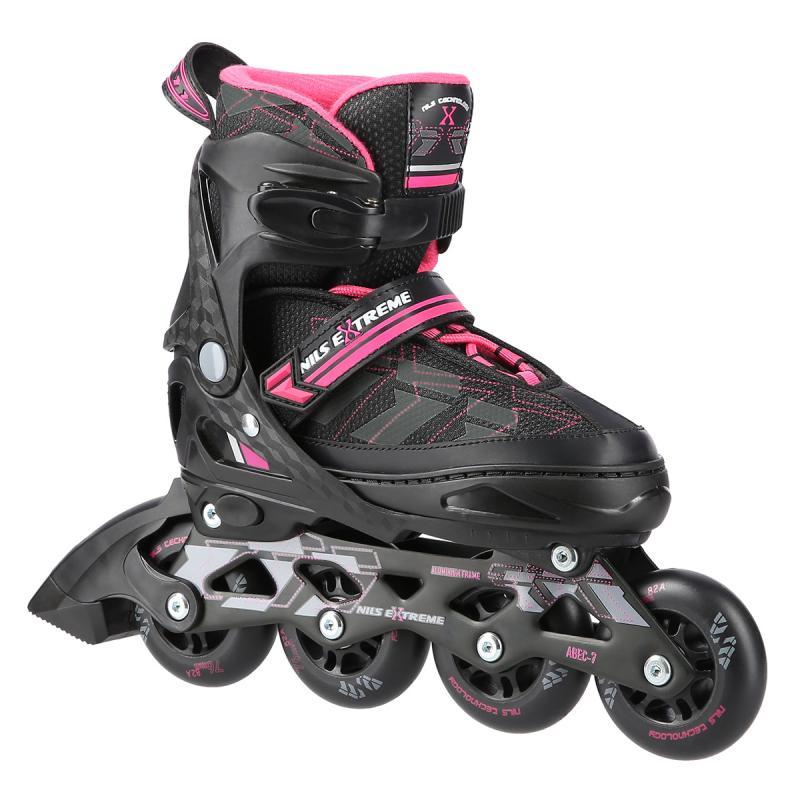 Kolieskové korčule NILS Extreme NA11002 sú určené na rekreačnú jazdu začínajúcich a mierne pokročilých korčuliarov po rovných a hladkých chodníkoch, ako napríklad po asfalte. Ľahká a odolná topánka zabezpečuje bezpečnosť pri jazde. Systém ventilácie a tvarovaná stielka topánky priamo ovplyvňujú zvýšenie užívateľského komfortu. Jedná sa o model s nastaviteľnou veľkosťou, kedy každá korčuľa má na výber zo 4 rozmerov. Pomocou jednoduchého riadiaceho systému je možné ľahko a rýchlo nastaviť veľkosť topánky na nohe užívateľa. Kolieska s tvrdosťou 82A sú uložené v hliníkovej lište, dobre priliehajú k podkladu a čiastočne pohlcujú nerovnosti. Model NA11002 je osadený ložiskami ABEC 7, ktoré sa vyznačujú precíznym spracovaním a nízkym odporom, kedy jazda má dobrú zotrvačnosť a na korčuliach tak možno prejsť dlhú vzdialenosť bez vynaloženia zbytočnej sily.